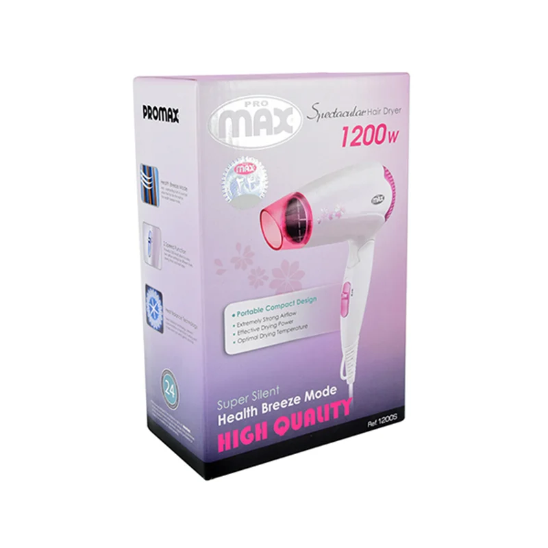 سشوار پرومکس مدل 1200S سشواری مسافرتی دارای موتور ۱۲۰۰ وات DC است که در دو رنگ آبی،صورتی،سبز عرضه میشود.طبق انتظاری که از یک سشوار مسافرتی میرود دستهی سشوار روی بدنه خم و جای کمتری اشغال میکند.بنابراین میتوان گفت که برای مسافرت یک سشوار ایده آل است؛ و بسیار سبک و کار با آن راحت است و مانع خستگی دست ها می شود.اما از آنجایی که قرار است حجم این دستگاه کم باشد موتور کم قدرتتری نسبت به سشوارهای خانگی یا حرفهای دارد.موتور سشوار پرومکس مدل 1200S همانطور که از اسمش نیز پیداست توانی برابر ۱۲۰۰ وات دارد و از نوع DC است.بنابراین نمیتوان پرتاب باد فوقالعادهای را از آن انتظار داشت اما برای مصارف کوتاهمدت گزینهی مناسبی است.روی دستهی سشوار یک دکمهی ۳ حالته وجود دارد که برای روشن/خاموش کردن دستگاه و تنظیم سرعت و حرارت باد استفاده میشود.همچنین این سشوار دارای طراحی ارگونومیک و کناره های آن از پلاستیک ضد لغزش هست که کار کردن با آن را آسان تر کرده است. از دیگر ویژگی های ظاهری سشوار پرومکس 1200S باید به حلقه آویز و همچنین طراحی خاص فیلتر هوای آن اشاره کرد که جلوهی ویژهای به آن بخشیده است.
