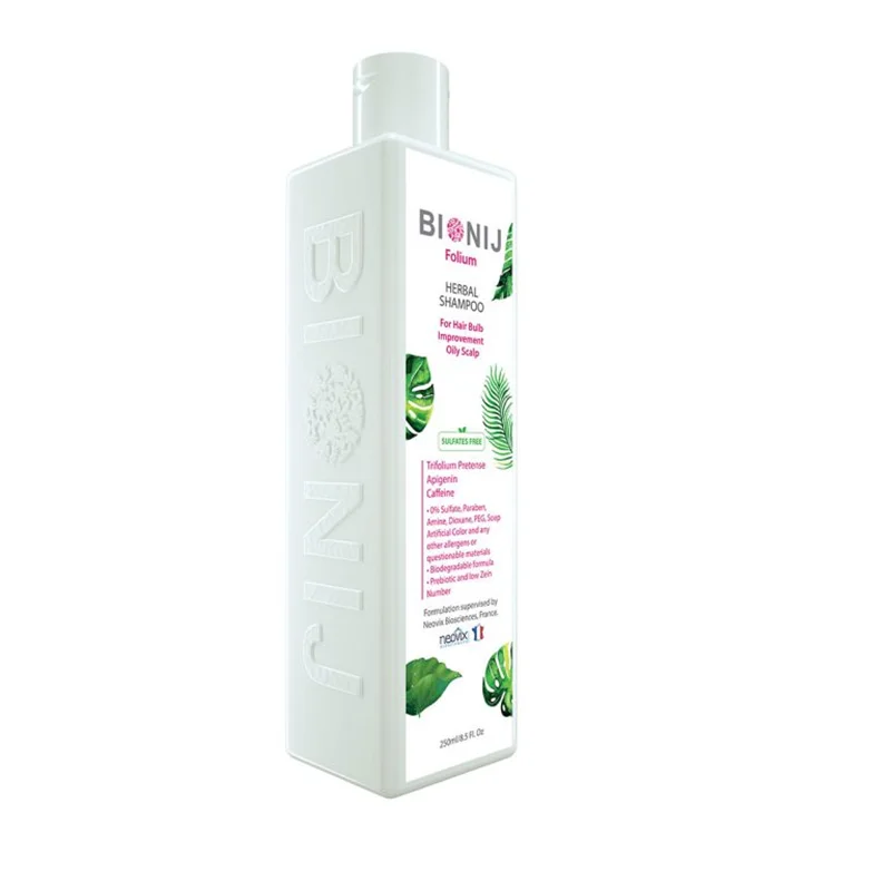 شامپو گیاهی Folium بیونیج:افزایش سن، آسیبرسانهای خارجی مانند آلودگی هوا، امواج ماورا بنفش نور خورشید، رادیکالهای آزاد و… بر عملکرد فولیکول و پیاز مو اثرات منفی دارند. این عوامل موجب کاهش حجم پیاز مو و رویش موهای نازکتر و نیز تضعیف فولیکول و کاهش استحکام مو در آن و در نتیجه ریزش موها شده و منجر به کاهش تراکم و کاهش رشد مو میشوند.شامپوی گیاهی تقویتکننده پیاز مو برای پوست سر چرب بیونیج با pH متناسب با پوست سر و با تنظیم ترشح چربی پوست سر بدون آسیب به سبوم مفید پوست سر، چربی و آلودگیها را از پوست سر بر طرف میکند همچنین ترکیبات گیاهی موجود در این شامپو موجب تقویت عروق خونی و افزایش جریان خون مویرگی میشوند و از فولیکول و پیاز مو در برابر آسیب رسانهای خارجی محافظت مینمایند. همچنین این شامپو با مهار فعالیت آنزیم 5-آلفا ردوکتاز و طولانی کردن فاز آناژن، ریزش مو را کنترل نموده و موجب افزایش استحکام و ضخامت موهای کرکی میشود.